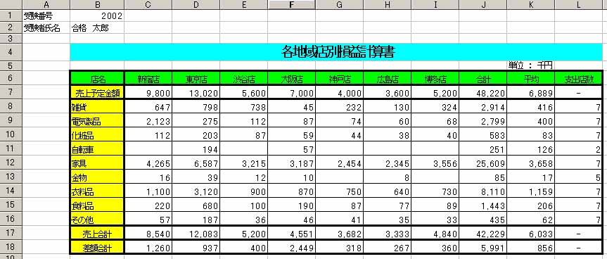 (2)セルB1に受験番号2002を入力しなさい、セルB2に受験者氏名を入力しなさい。 (3)セルB4のタイトル「各地域店別損益計算書」のフォントを16ポイント、太字にし、セルを結合して セルB4〜L4の範囲内で中央に配置しなさい。 (4)6行目及びセルB7、B17〜B18の項目名を、各セルにおいて横位置の中央に配置しなさい。 (5)セルJ7〜J16までの「合計」を、関数を用いて求めなさい。 (6)セルC17〜J17の売上合計とセルK8〜K18の平均を関数を用いて求めなさい。 (7)セルC18〜J18の差額合計を次の計算式を用いて求めなさい。 差額合計=売上予定金額−売上合計 (8)セルL8〜L16の「支出店数」を関数を用いて、それぞれ求めなさい。 (9)セルC7〜L18の金額を表す数値の表形式を、小数点以下0桁(整数)の3桁区切り表示にしなさい。 (10)入力されたデータが、すべて表示されるようにセル幅を調整しなさい。 (11)結果を「問題4Q1.sxc」のファイル名で保存しなさい。 上記の課題が完了したら、メールに添付して送付してください。 メールの送付先はnikoniko@mx8.tiki.ne.jpです。 メールの本文にはお名前とメールアドレスは必ず入れてください。